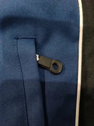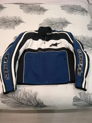 Chaqueta de moto Alpinestars con un diseño deportivo y llamativo. - Combinación de colores azul, blanco y negro. - Logos de Alpinestars en mangas y cuello. - Cierre frontal con cremallera. - La chaqueta lleva las protecciones - está muy bien, lo único que las cremalleras se ha partido un poco de dónde se tira, pero se puede usar igual. - Las letras se van sin hacer nada, pero es problema del tejido, y le ha pasado a todas las de la marca, pero la chaqueta está perfecta q es lo importante. -Forro desmontable para invierno y verano - Talla L