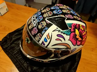 Casco de moto con un diseño llamativo y colorido. - Decoración con calaveras estilo Día de Muertos. - Motivos florales vibrantes. - Visera transparente.