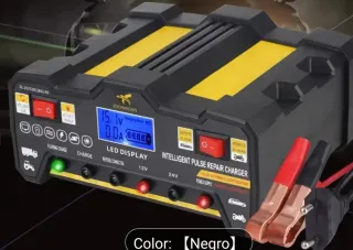 Cargador inteligente de pulso para baterías de vehículos. - Pantalla digital de voltaje y amperaje. - Indicadores LED para estado de carga. - Diseño robusto y portátil.