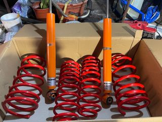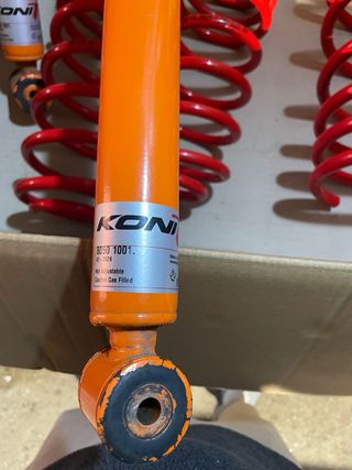Kit de suspensión Koni treaseros ,con muelles Cobra para Seat Leon MK1. El kit incluye dos amortiguadores Koni de color naranja y cuatro muelles de color rojo usados un año - Amortiguadores Koni naranjas. - Muelles Cobra rojos.