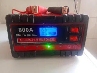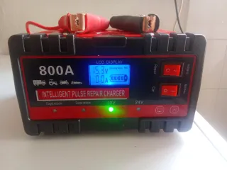 Cargador de baterías inteligente con pantalla LCD y función de reparación de pulsos. - Capacidad de 800A. - Indicado para coches, motos, camiones y otros vehículos. - Pantalla LCD para visualización de voltaje y amperaje. - Modos de carga: Inteligente, Reparación y Coche. - Indicadores LED para estado de carga y fallo. - Compatible con sistemas de 12V y 24V.