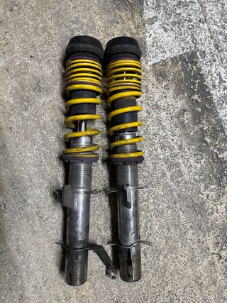 Conjunto de amortiguadores roscados KW. - Muelles de color amarillo. - Cuerpo roscado para ajuste de altura. - Topes de goma negros en la parte superior. leon, golf, audi, a3, fr, gti,tdi.