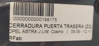 Pieza 199175 - OPEL ASTRA J LIM. Cosmo CERRADURA PUERTA TRASERA IZQUIERDA. con referencia: A17DTR. . Se puede obtener más información en el sitio web