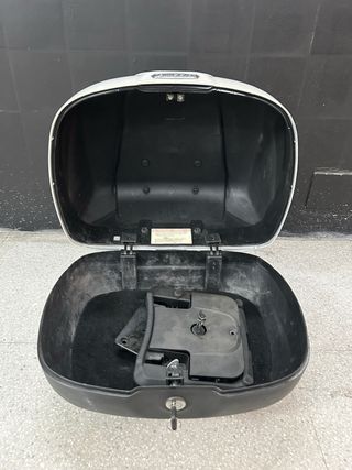 Maleta superior Piaggio de 37 litros en color blanco. Tiene un roce en el lateral izquierdo pero es estético. - Incluye parrilla para mas modelos ademas de un soporte metálico específico para motos de la marca Piaggio. - Viene con 1 Llave - Tambien tiene el respaldo para que el pasajero pueda apoyarse.