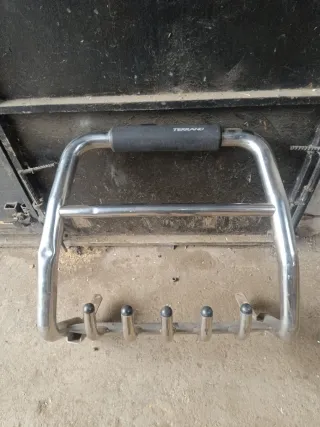 Defensa delantera original para Nissan Terrano. - Fabricada en acero inoxidable pulido. - Incluye barra protectora superior con agarre de goma. - Diseño robusto con cinco soportes inferiores.