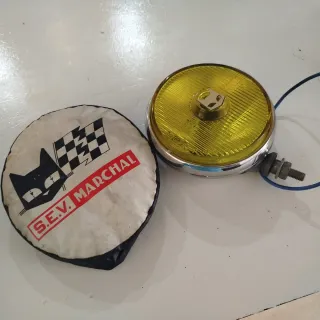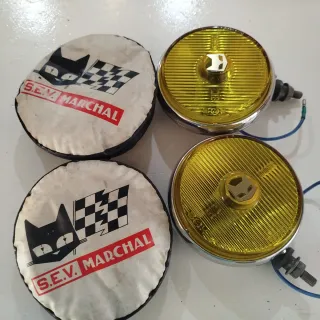 Se venden dos faros antiniebla S.E.V. Marchal con sus fundas protectoras. - Faros con lente amarilla. - Incluye fundas protectoras con logo de gato y bandera a cuadros. - Marca: S.E.V. Marchal.