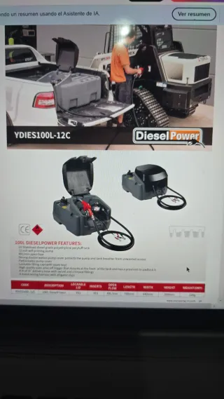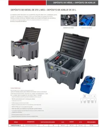 Depósito combinado de polietileno de alta resistencia para diésel y AdBlue. - Capacidad de 370 L para diésel y 30 L para AdBlue. - Bomba autocebante de 12V para diésel. - Manguera de 4 m con pinzas de cocodrilo. - Filtro de malla con ventosa en la línea de succión. - Tapa con cerradura para el depósito de diésel y la bomba. - Incluye bomba y boquilla para AdBlue.