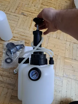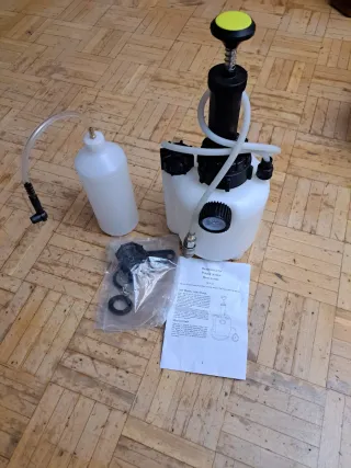 Kit para purgar frenos de forma manual. Incluye un depósito para recoger el líquido y una bomba de vacío. - Bomba de vacío con manómetro. - Depósito de recogida de líquido. - Manguera de conexión. - Adaptadores y accesorios.