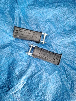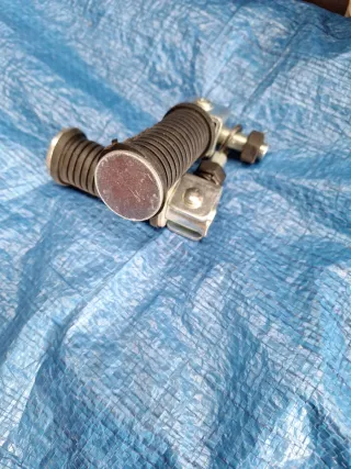 Set de gomas y soportes para estribos de motocicleta. Piezas metálicas con empuñaduras de goma. - Incluye dos gomas de estribo. - Incluye dos soportes metálicos para estribo.