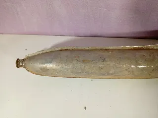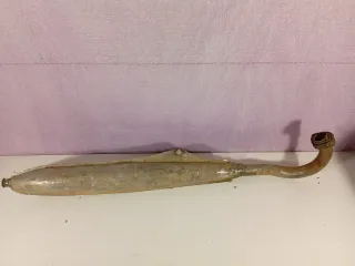 Pieza de escape para motocicleta antigua. Presenta un diseño alargado y curvo, típico de modelos clásicos. - Material metálico. - Acabado desgastado por el tiempo.