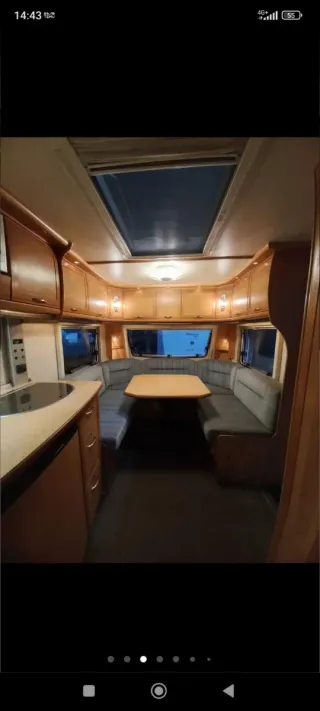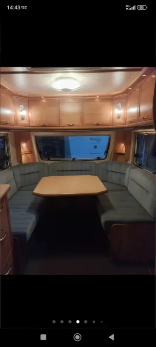 Interior de caravana con asientos en forma de U y mesa. - Asientos tapizados en tela gris con detalles a rayas. - Mesa de madera con forma octogonal. - Armarios superiores de madera clara. - Iluminación empotrada en el techo. Caravana para dejar fija