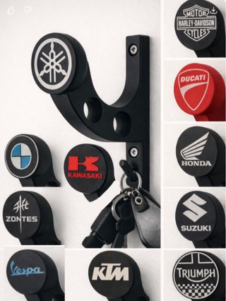 Este soporte de pared es ideal para organizar tus llaves y casco. - Diseño moderno y funcional. - Acabado en negro mate. - Incluye varios soportes con logos de marcas de motos.
