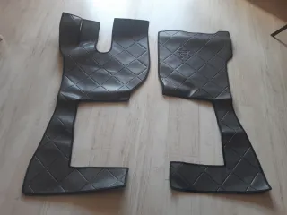 Alfombrillas de cuero gris para Volvo FH. Diseñadas con un patrón acolchado de rombos. - Material: Cuero sintético. - Color:gris. - Diseño: Acolchado de rombos. - Incluye dos piezas.
