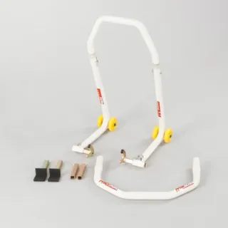 Caballete para moto PROWORKS, versátil y práctico. Posibilidad de uso delantero o trasero - Diseño 2 en 1. - Estructura blanca. - Ruedas amarillas para fácil movilidad. - Incluye soportes adicionales.