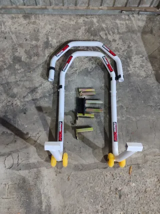 Caballete portátil para moto, ideal para mantenimiento o transporte. - Construcción robusta y plegable. - Base ajustable para mayor estabilidad. - Incluye correa de sujeción para freno delantero -Lo usaba en una naked de 200kg -Lleva un recubrimiento en la zona de contacto para evitar arañar basculante