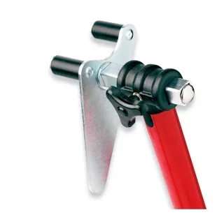 Caballete delantero a la horquilla. Específico para horquillas con agujero inferior. Fabricado en tubo de acero de una sola pieza de Ø35 mm, pintado de rojo especial a base de polvo de poliéster. Incluye 2 ruedas de nylon de Ø90mm para situar fácilmente el caballete en el vehiculo.