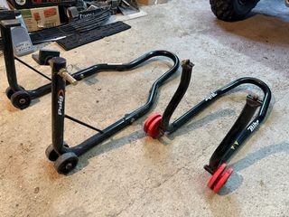 Se venden dos caballetes para moto, uno rojo y otro negro. Perfectos para mantenimiento o exhibición. - Caballete delantero rojo. - Caballete trasero negro. - Incluyen ruedas para facilitar el movimiento.