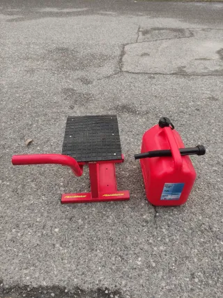 Se vende caballete para moto en color rojo, junto con una garrafa de combustible de 10 litros. - Caballete de metal resistente. - Superficie de apoyo antideslizante. - Garrafa de plástico rojo con asa y boquilla.