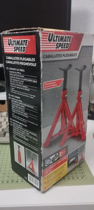 Par de caballetes plegables de la marca Ultimate Speed. Son robustos y fáciles de guardar. - Capacidad de carga hasta 2000 kg. - Diseño plegable para ahorrar espacio. - Tres posibles alturas: 27.6, 32.3 y 36.3cm. - Perno de seguridad. - Certificación GS. Se vende por falta de uso.