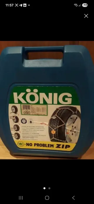 Cadenas para nieve de la marca KÖNIG, modelo CB-12. - Incluye caja de almacenamiento. - Certificación SAE Class S. - Fabricadas en Europa.