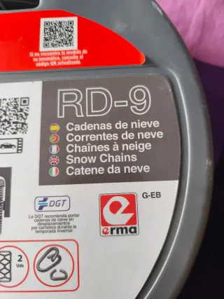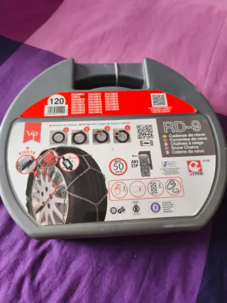 Cadenas nieve. RD9. Acero ladeado, 120 pulgadas. La caja contiene 2 guantes, kit de eslabones para reparación. Eslabones de 9 mm con cierre autoblocante y tensor de goma y tratamiento zinc. Certificado. Nunca se han usado ni abierto el embalaje