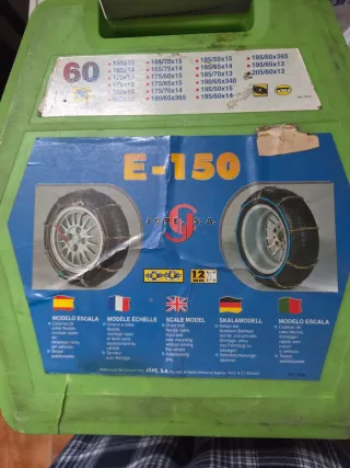 Cadenas para nieve marca JOPE, modelo E-150. Incluye instrucciones en varios idiomas. - Cadenas para neumáticos. - Modelo E-150. - Fabricado en España. - Incluye caja de almacenamiento.