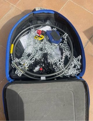 Cadenas para neumáticos de coche, ideales para condiciones de nieve o hielo. estàn sin estrenar porque cuando quise usarlas resultó que las llantas del coche que uso son de 16" y estas cadenas spn de 13". por eso las vendo. - Incluye caja de almacenamiento azul. - Cadenas de metal con recubrimiento de goma azul.