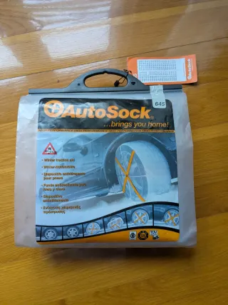 Cadenas de nieve de tela AutoSock, modelo 645. Ayuda de tracción para invierno. - Dispositivo antideslizante para hielo y nieve. - Alta adherencia en condiciones invernales. Nunca han sido utilizadas ni sacadas del paquete. En la foto se puede observar la etiqueta de las tallas de neumático.