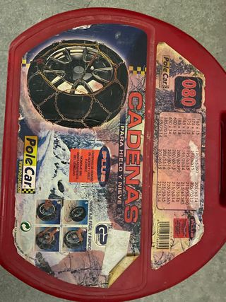Cadenas para nieve de la marca Michelin, completamente nuevas y sin estrenar. Vienen en su caja original para guardarlas fácilmente. La caja se ve gastada, porque fueron siempre en el maletero del coche. Comprobar etiqueta para ver si sirven para su coche. - Cadenas de metal. - Incluye bolsa de plástico para guardarlas.