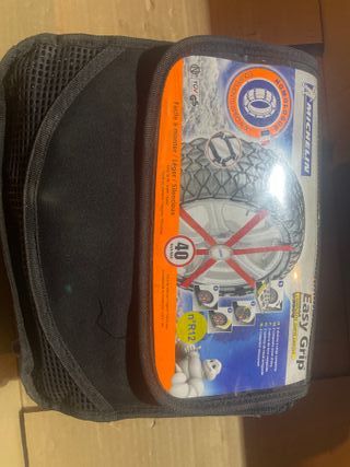Cadenas para la nieve Michelin Easy Grip, modelo L12. Son fáciles de montar, ligeras y silenciosas. - Cadenas de composite. - Homologadas. - Velocidad máxima recomendada: 40 km/h. - Incluye bolsa de transporte. Se han utilizado una única vez en un A3. Se venden por que hemos cambiado el coche y no nos sirven con las ruedas que tenemos.