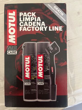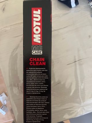 Kit de limpieza Motul para cadenas de moto, en perfecto estado. Incluye lubricante y limpiador de cadena, además de un cepillo. - Limpia eficazmente la suciedad y la grasa. - Lubrica y protege la cadena. - Cepillo para una limpieza más precisa. - Ideal para todo tipo de motocicletas.