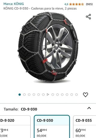 KÖNIG CD-9 030 - Cadenas para la nieve, 2 piezasMarcaKÖNIG MaterialNailon Tipo de servicio del vehículoCoche Núm. de identificación comercial global08005438007739 155/80-12, 165/70-12, 145/80-13, 155/70-13, 165/65-13, 175/60-13, 135/80-14, 175/50-14, 135/70-15, 165/50-15 La cadena de tensado manual. 9 mm de espacio entre la cubierta y la carrocería. Protectores de nailon que protegen las llantas de aleación contra arañazos (opcionales). Homologaciones, certificaciones y conformidad con: Ö-Norm 5117, UNI 11313, TÜV.