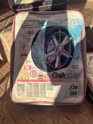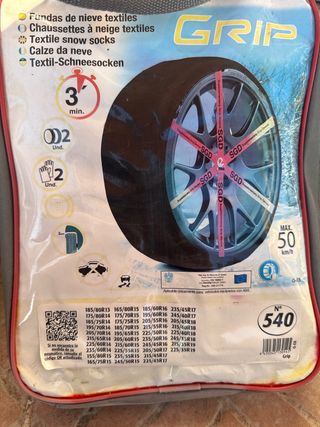 Cadenas textiles de nieve Grip, modelo N°540. Son nuevas y vienen en su embalaje. - Incluye 2 cadenas textiles. - Se incluyen 2 guantes. - Tiempo de montaje aproximado: 3 minutos. - Compatibles con ABS y ESP. - Velocidad máxima recomendada: 50 km/h. - Certificación TÜV SÜD y GS.