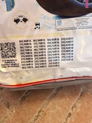 Vendo cadenas para nieve Norauto Winter Tex II, talla XL. Están en perfecto estado y se encuentran en su caja original. - Son aptas para neumáticos de diferentes medidas (ver tabla en la imagen). Yo las compré para un Toyota CHR. - Fáciles de instalar. - Incluyen bolsa de transporte.