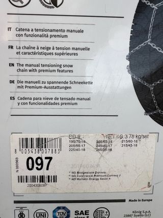 Cadenas para nieve manuales con características premium. - Modelo CD-9. - Peso: 3.78 kg/set. - Medidas compatibles: 195/70-16, 205/55-17, 225/40-18, 205/65-16, 245/40-17, 245/35-18, 215/60-16, 215/45-18. - Fabricadas en Europa.