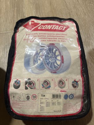 Cadenas textiles para nieve marca Contact, modelo T04. Son fáciles de montar y desmontar. - Incluye instrucciones de montaje. - Homologadas según ÖNORM V 5121. - Velocidad máxima recomendada: 50 km/h. - Medidas compatibles: ver foto. - Fabricadas en Túnez.