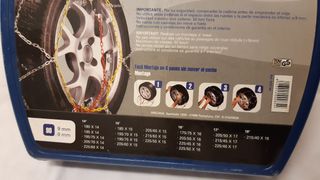 Cadenas para la nieve modelo V4-90. - Cadena cementada y zincada de 3,5 mm de diámetro. - Cable de acero de 12 mm de grosor. - Incluye maletín de plástico para guardarlas.