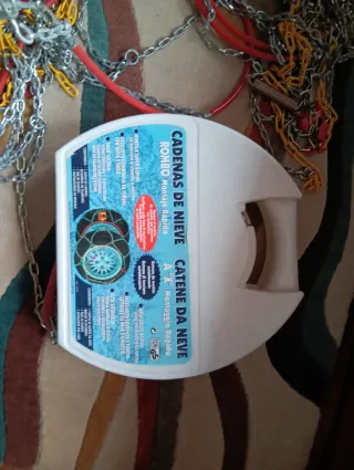 Cadenas para nieve para coche, modelo RD-9. Están en buen estado y se encuentran en su caja original. - Válidas para neumáticos de 155/80-13 a 205/70-15. - Sistema de montaje automático. - Se adaptan a vehículos con o sin ABS. - Incluye bolsa de transporte.