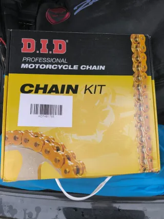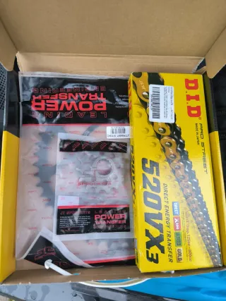 Kit de arrastre completo para moto, nuevo y sin usar. Incluye cadena y piñones. KTM 690 SMC/Enduro el 2019-2024. - Cadena DID 520VX3. - Piñones JT Sprockets. - Color negro y dorado.