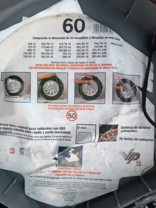 Cadenas para nieve de la marca VP, modelo 60. Diseñadas para vehículos con ABS y espacio reducido entre rueda y parte mecánica. Un solo uso. - Grosor de 9 mm. - Sistema de bloqueo automático. - Contiene eslabones de repuesto. Ver medidas en foto para comprobar si valen a tu coche.
