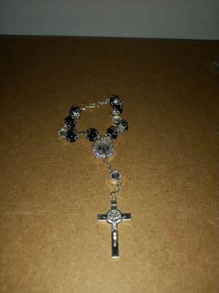 Rosario con cuentas negras y detalles plateados, perfecto para colgar en el coche. Incluye una cruz con un diseño especial. - Cuentas de color negro. - Detalles y cadena en tono plateado. - Cruz decorada.