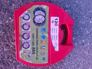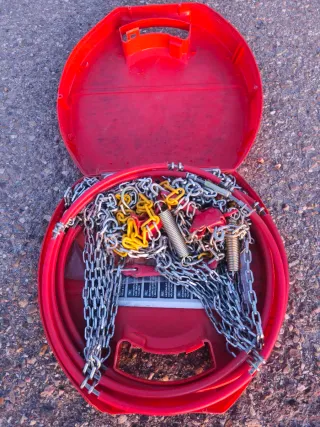 Set de cadenas para nieve en su caja. Sin usar. - Cadenas de metal. - Incluye tensores de goma. - Caja de plástico roja para almacenamiento.