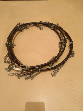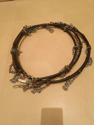 - Cadenas para circular con nieve. - Ideales para circular con seguridad en invierno. - Fáciles de colocar y usar. - Se venden por cambio de coche. - Se incluyen dos cadenas para neumáticos. - No se han tenido que usar nunca, pero a una de ellas se le ha ido el brillo, quizás por probarse sobre una rueda mojada y luego guardarse, pero está en buenas condiciones. - Se entregan en zona Guadalajara-Alcalá de Henares o en zona Aranda de Duero.