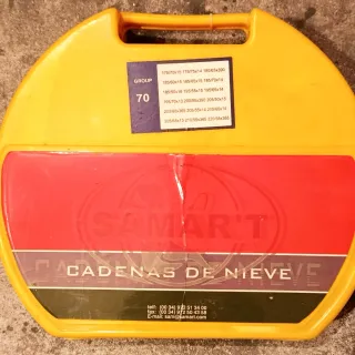 Cadenas para la nieve, grupo 70, en su estuche original. - Medidas compatibles: 175/70x15, 175/75x14, 180/65x390, 185/60x15, 185/65x15, 185/70x14, 185/50x16, 195/55x15, 195/65x14, 195/70x13, 200/55x390, 205/50x15, 200/60x365, 205/55x14, 205/60x14, 205/65x13, 210/55x365, 220/55x365. - Estuche amarillo con asa. - Incluye información de contacto de Samar't.