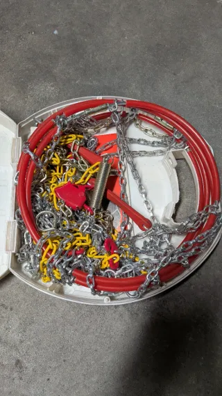Vendo juego de cadenas de nieve totalmente nuevo en su caja. Nunca se ha usado y ya no tengo el vehículo para el que se compraron. Válidas para muchas medidas de rueda, se pueden ver en las fotos.