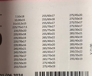 Cadenas nieve TALLA 70. En la foto aparecen todas las medidas de neumático compatibles