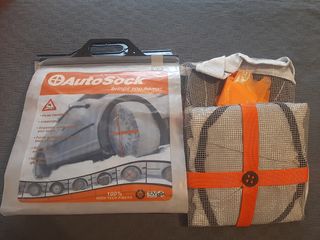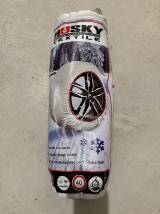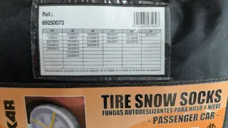 Juego de fundas textiles antideslizantes para neumáticos. Poco uso, una de las dos tiene dos pequeños rasguños, por lo de mas, bien. - Incluye 2 fundas textiles. - Diseñadas para mejorar la tracción en nieve y hielo. - Compatibles con una amplia gama de medidas de neumático (ver listado en la imagen). - Fabricadas en material textil resistente.