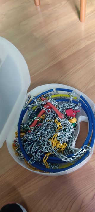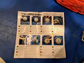 Juego de cadenas para nieve, ideales para mejorar la tracción en superficies heladas o nevadas. Incluye una bolsa de almacenamiento e instrucciones para ponerlas. Nunca se han usado. Las compré para una furgoneta con neumáticos 225 65 16. No se si valen para otras medidas. - Cadenas de metal resistentes. - Bolsa de tela roja para guardarlas.
