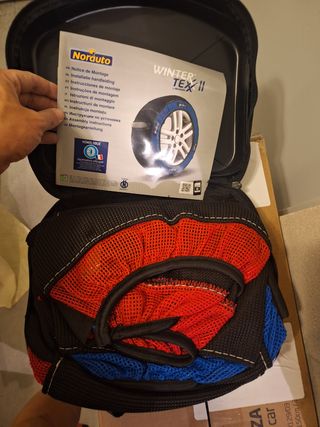 Cadenas textiles para nieve Norauto Winter Tex II, talla M. No se han utilizado, sin estrenar. - Montaje fácil y rápido. - Adherencia y frenado optimizados. - Homologadas. - Incluye bolsa de transporte y guantes.