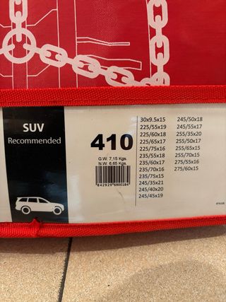 Cadenas para la nieve Snovit, modelo 410, recomendadas para SUV. - Peso bruto: 7,15 Kgs. - Peso neto: 6,65 Kgs. - Tamaños compatibles: - 30x9.5x15 - 225/55x19 - 225/60x18 - 225/65x17 - 225/75x16 - 235/55x18 - 235/60x17 - 235/70x16 - 235/75x15 - 245/35x21 - 245/40x20 - 245/45x19 - 245/50x18 - 245/55x17 - 255/35x20 - 255/50x17 - 255/65x15 - 255/70x15 - 275/55x16 - 275/60x15